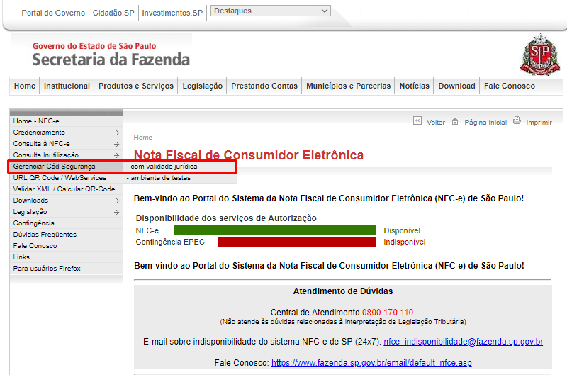 Volta a tela inicial da NFC-e do site da SEFAZ SP: http://www.nfce.fazenda.sp.gov.br/NFCePortal/¶