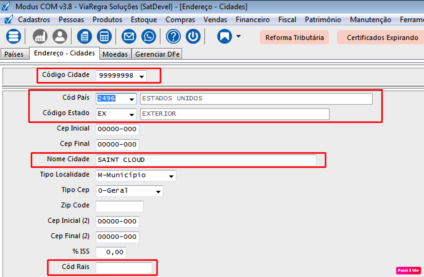 • Cadastrar a Cidade com o Codigo 99999999 ou o anterior mais proximo que esteja livre. Ex: 99999998, 99999997..