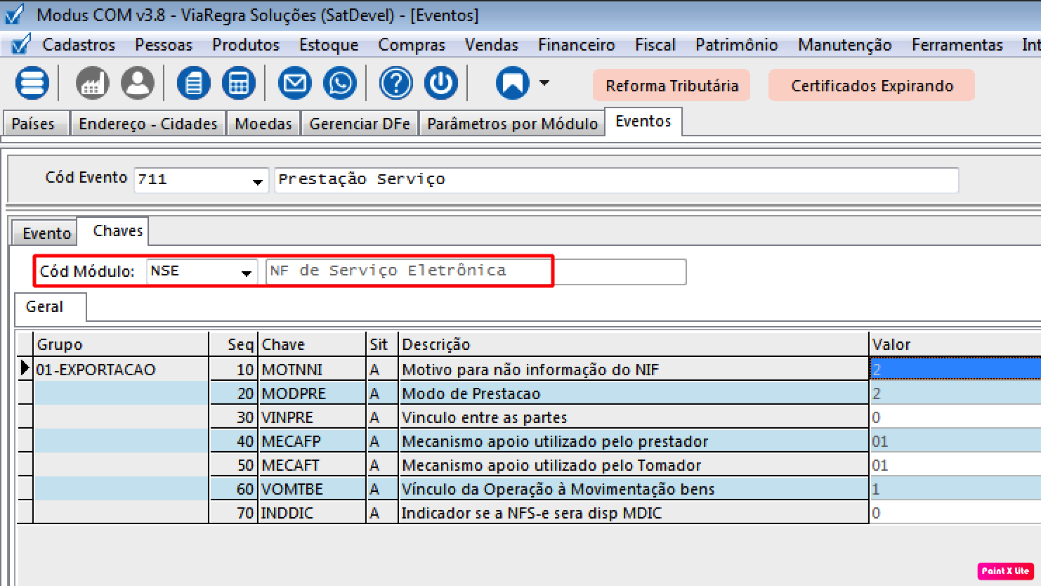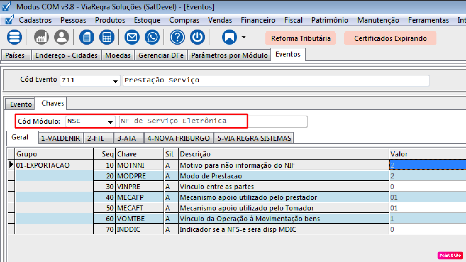 • No cadastro do Evento ative o Módulo NSE que possui alguns parâmetro necessários para NFSe Padrão Nacional. (Estes parametros ja estão preenchidos com um valor default e deve ser avaliado se ha necessidade de alteração)