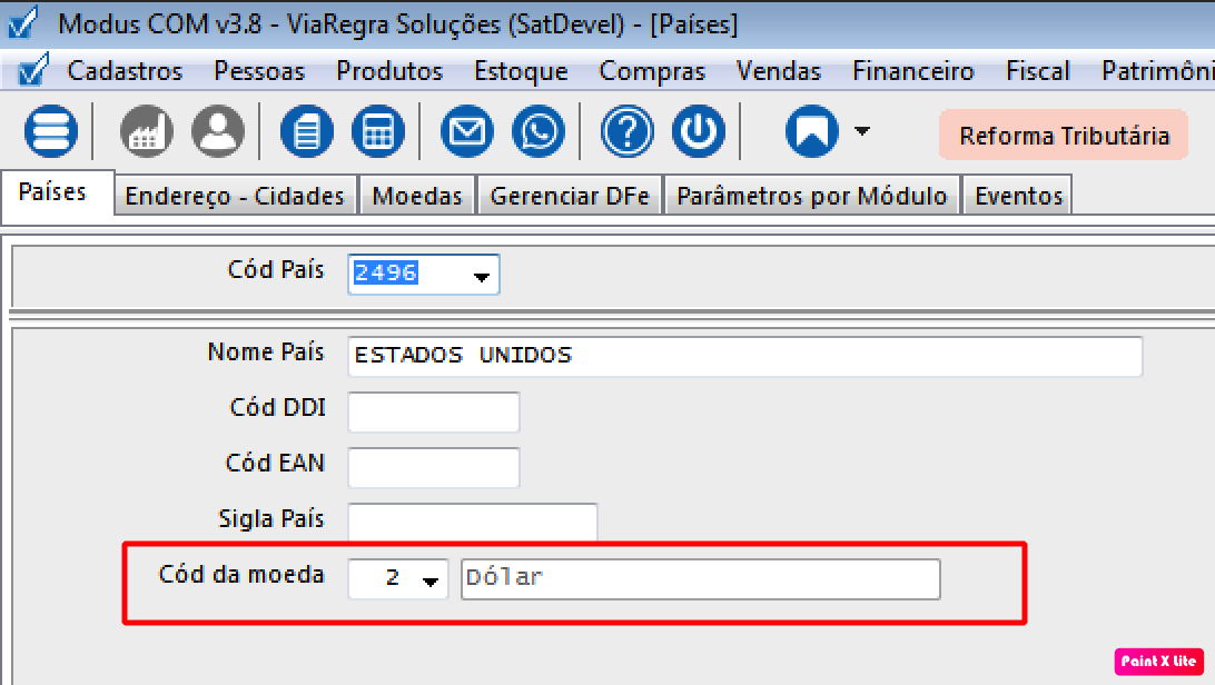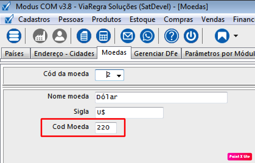 • No cadastro de Moedas no campo Cod Moeda logo abaixo da sigla, informe o codigo da moeda de acordo com a tabela de moedas do Banco Central do Brasil