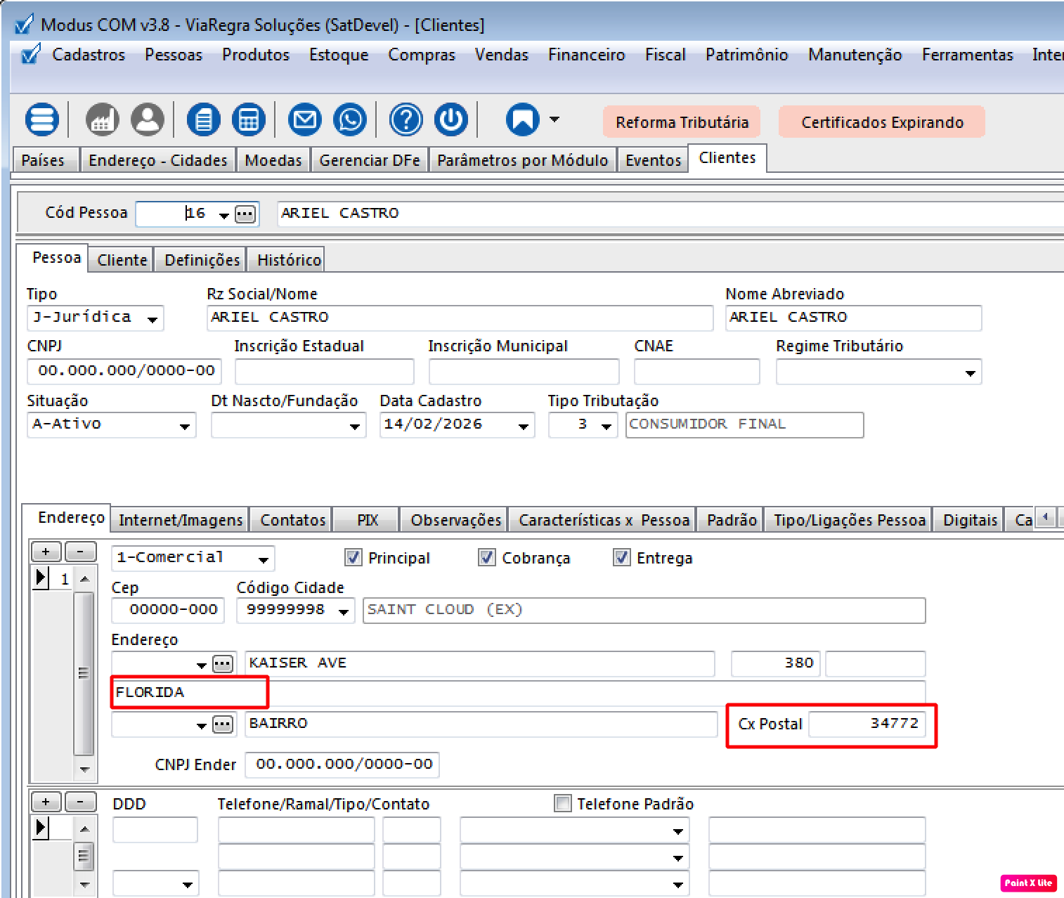 • No campo CX Postal do endereço do Cliente informe o Código de Endereçamento Postal do endereço no exterior.