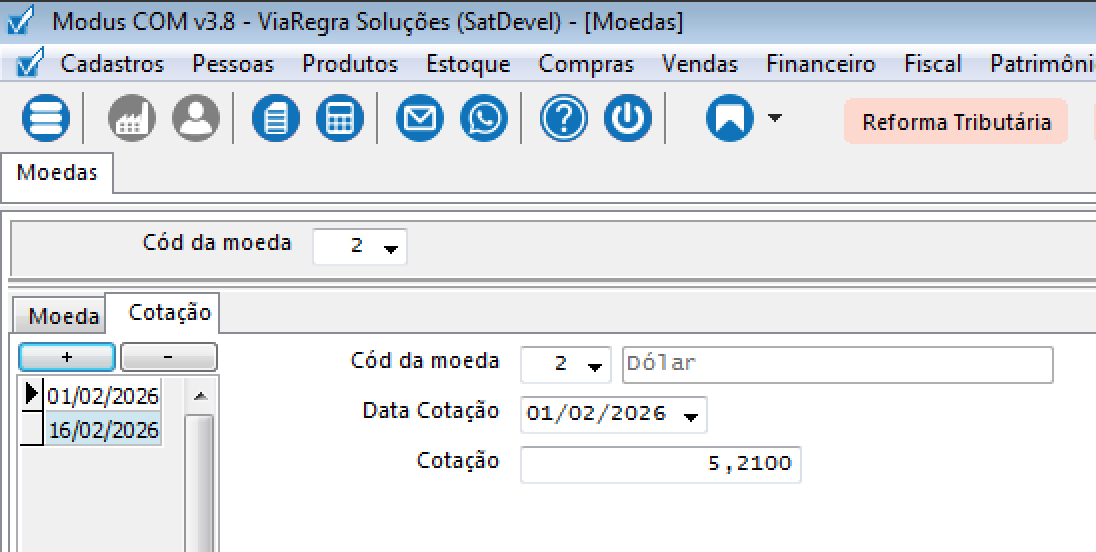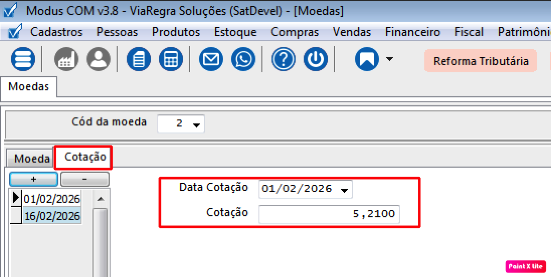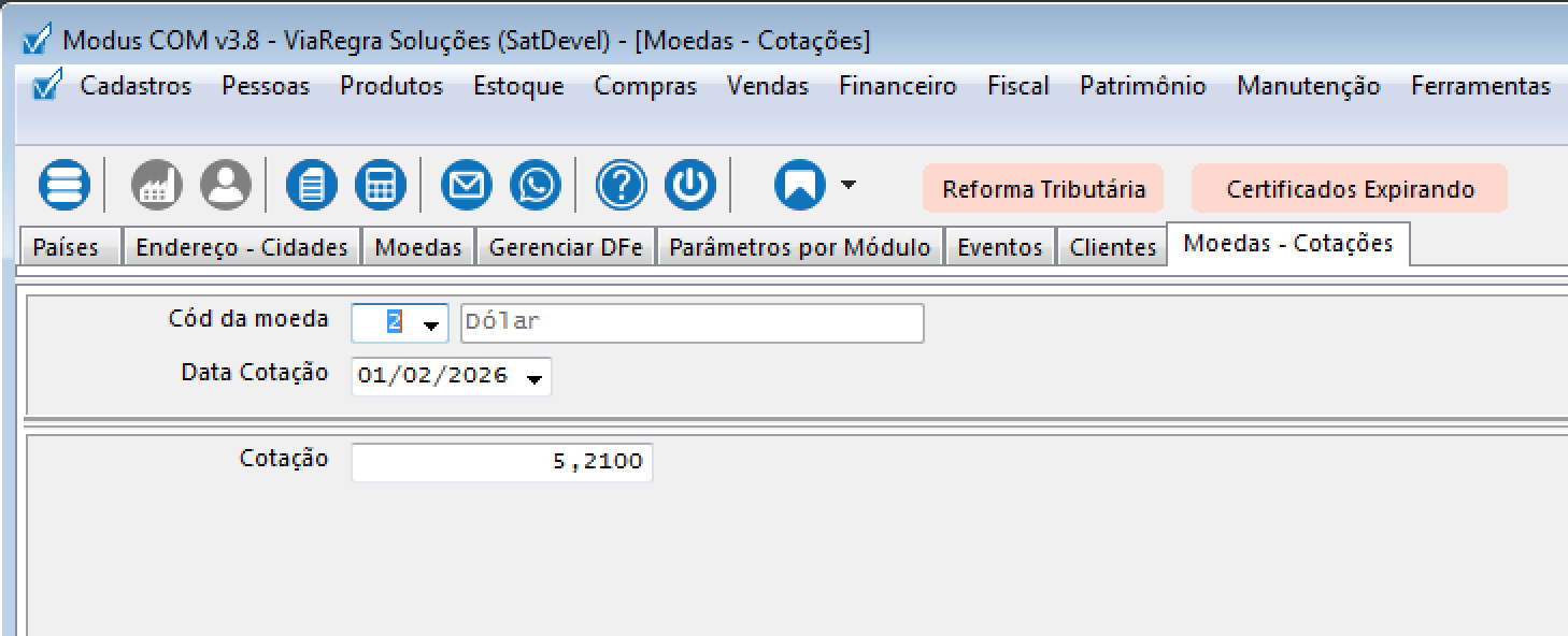 • Cadastre a cotação da moeda, o Sistema irá busca a partir da data de emissao da NF ou mais recente